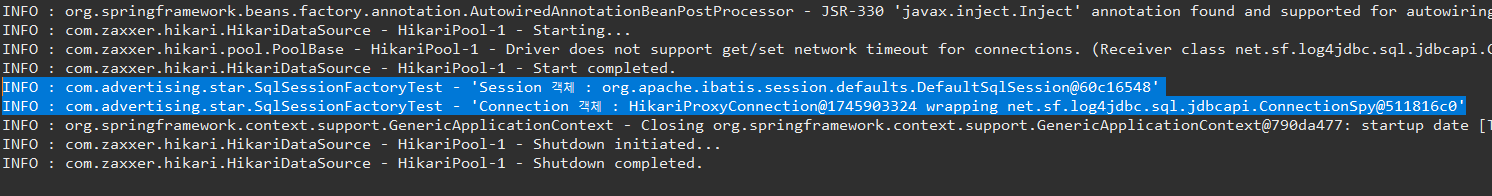 SqlSession과 Connection객체가 정상적으로 만들어지면 다음과 같이 log가 기록됩니다.