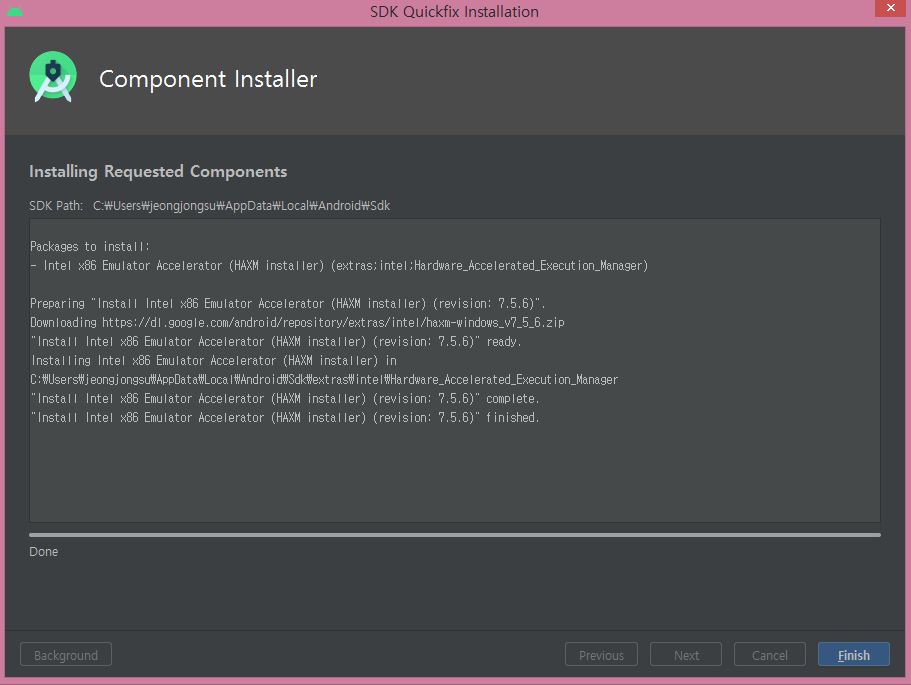 Component Installer 설치가 완료되면 Finish버튼 클릭