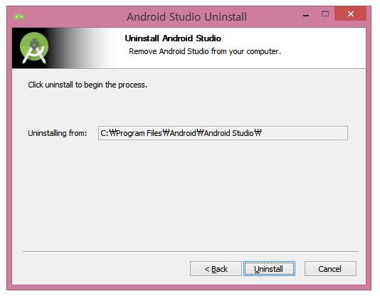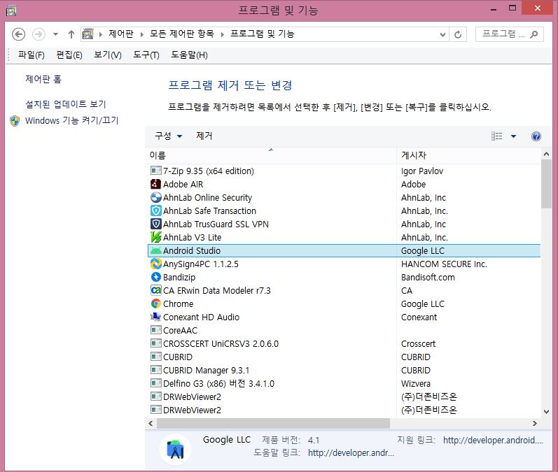1. 제어판 -> 프로그램 제거 -> 안드로이드 스튜디오 선택 후 제거 클릭