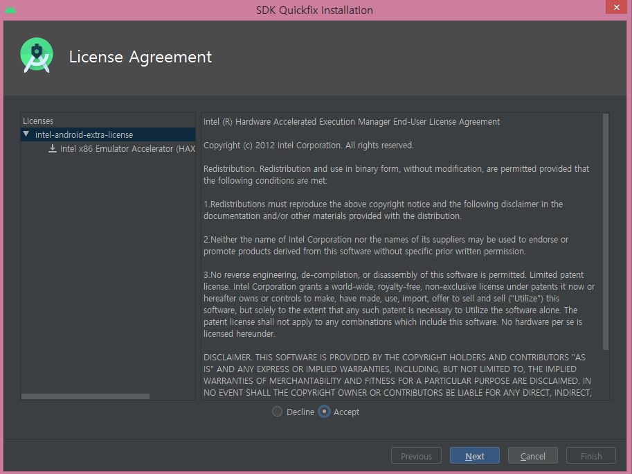 라이선스 동의 화면입니다. Accept를 선택 후 Next 클릭