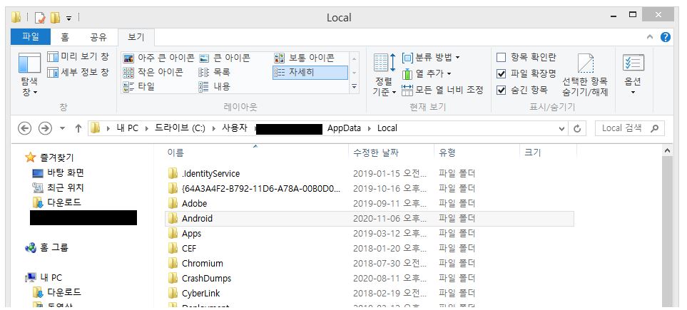 C:\Users\사용자 계정명\AppData\Local 해당 경로에 있는 Android 디렉터리를 삭제해주시면 됩니다.