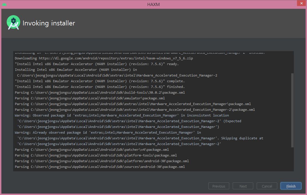 Invoking installer 설치가 완료되면 Finish 클릭