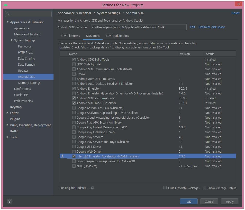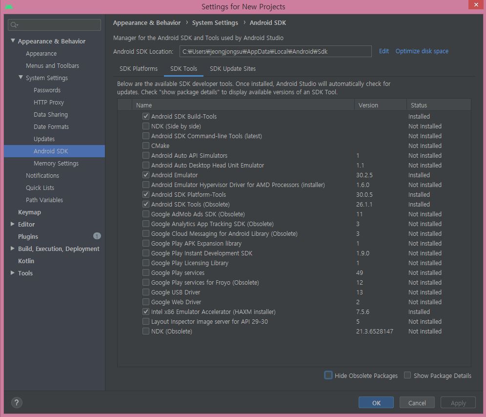 SDK Tools 탭에서 다음 항목이 Installed 되어 있는지 확인하세요.