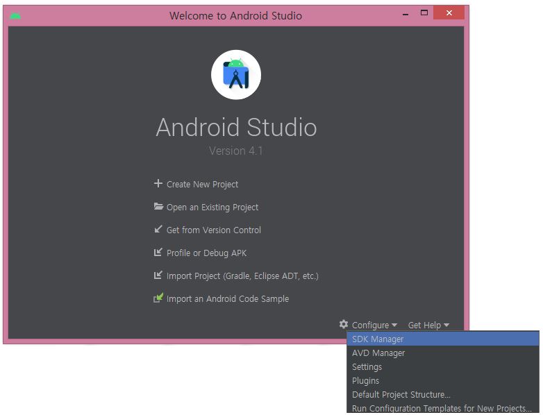실행된 안드로이드 스튜디오 화면 하단에 Configure -> SDK Manager 클릭