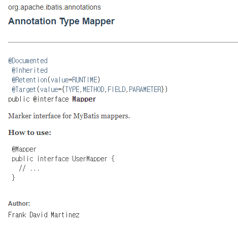 API문서에서 보면 Mapper의 코드는 단순히 meta annotation이 붙어있고 안에 내용은 딱히 작성된 게 없고, MyBatis의 mappers를 위한 marker interface로 사용한다고 설명이 되어있습니다.