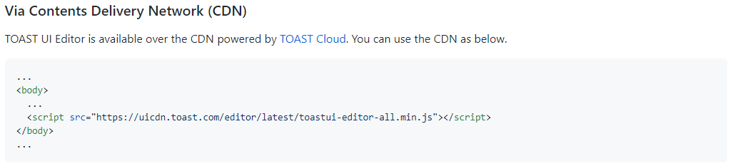 외부 라이브러리의 URL 주소는 가이드 문서(github.com/nhn/tui.editor/blob/master/apps/editor/docs/getting-started.md)에서 확인할 수 있고, 2가지 방식으로 불러올 수 있습니다.