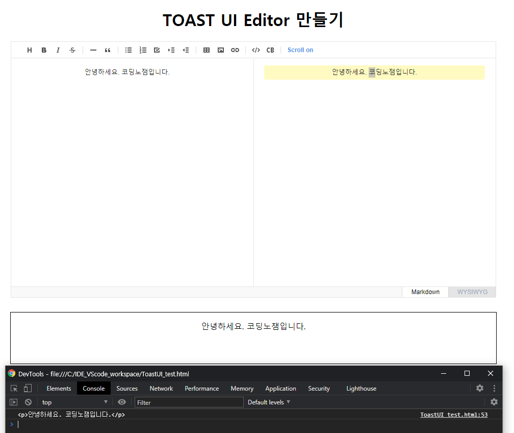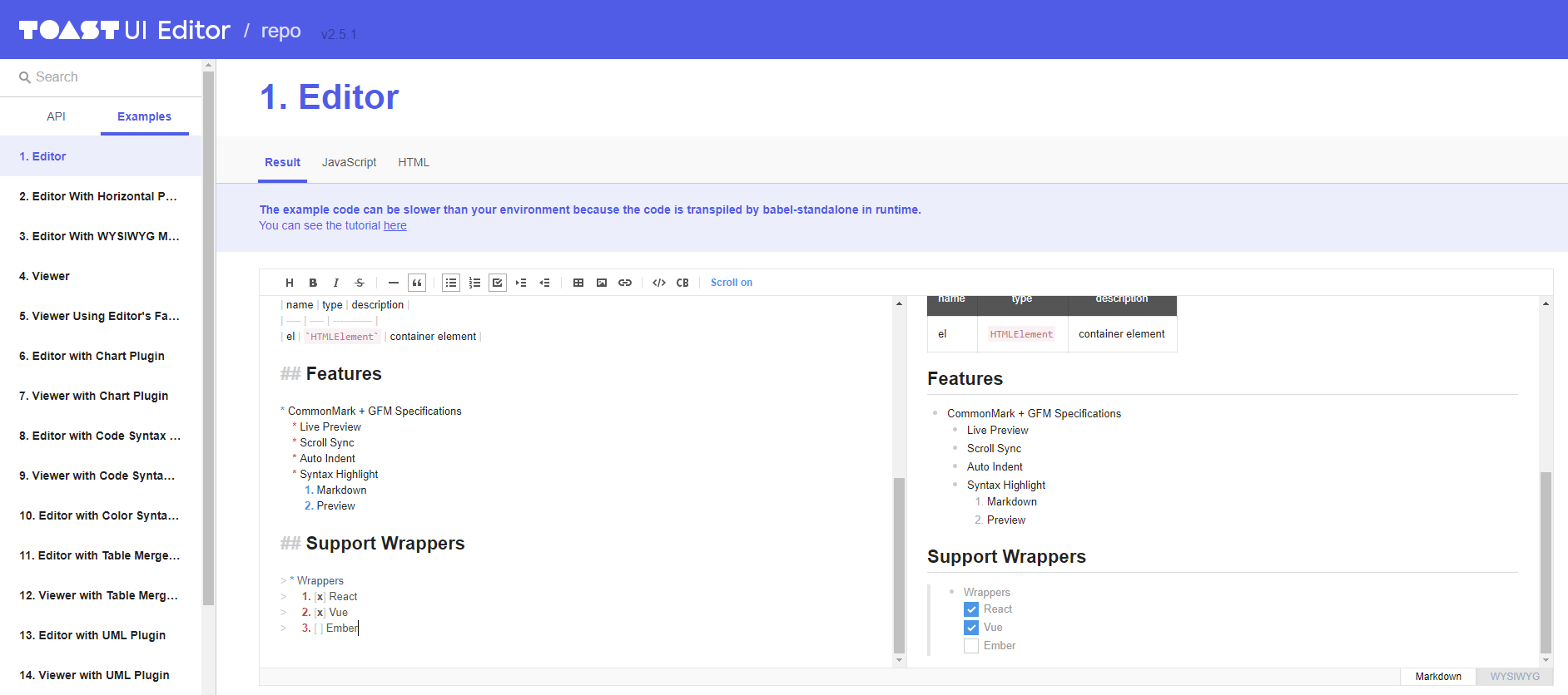 가운데 콘텐츠 화면에서 JavaScript와 HTML탭을 눌러보시면 구현에 필요한 소스를 소개해 주고 있으므로 이를 이용해서 TOAST UI Editor를 만들면 됩니다.