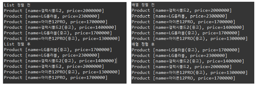 main메서드를 보면 리스트일 때와 배열일 때 사용하는 정렬 함수가 다른 것을 볼 수 있습니다.