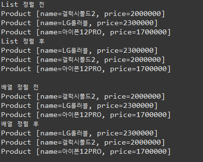compareTo() 메서드를 수정해주었고, 테스트를 위해 Product 객체를 추가해주었습니다.
