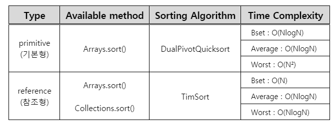 그러므로 만약에 정렬 알고리즘 문제 등등과 같이 시간 복잡도 O(NlogN)을 보장하는 정렬 코드를 작성해야 한다면 기본형 타입의 배열을 Arrays.sort()로 정렬하는 것은 다시 한번 생각해보셔야 할 것입니다.