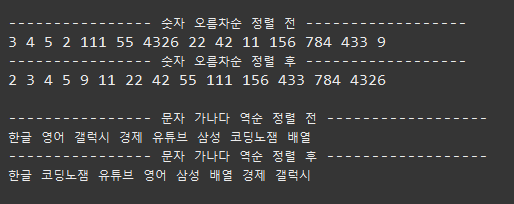 System.out.println("---------------- 숫자 오름차순 정렬 후 ------------------");