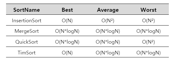 위의 표를 보시면 TimSort는 최선의 상태에서는 삽입 정렬의 시간 복잡도 O(N)를 최악의 경우에는 병합 정렬의 시간 복잡도 O(N*logN)을 가집니다.