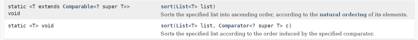 API 공식문서에서 Collections.sort()를 찾아보시면 위와 같이 2개의 overloading 메서드가 있습니다.