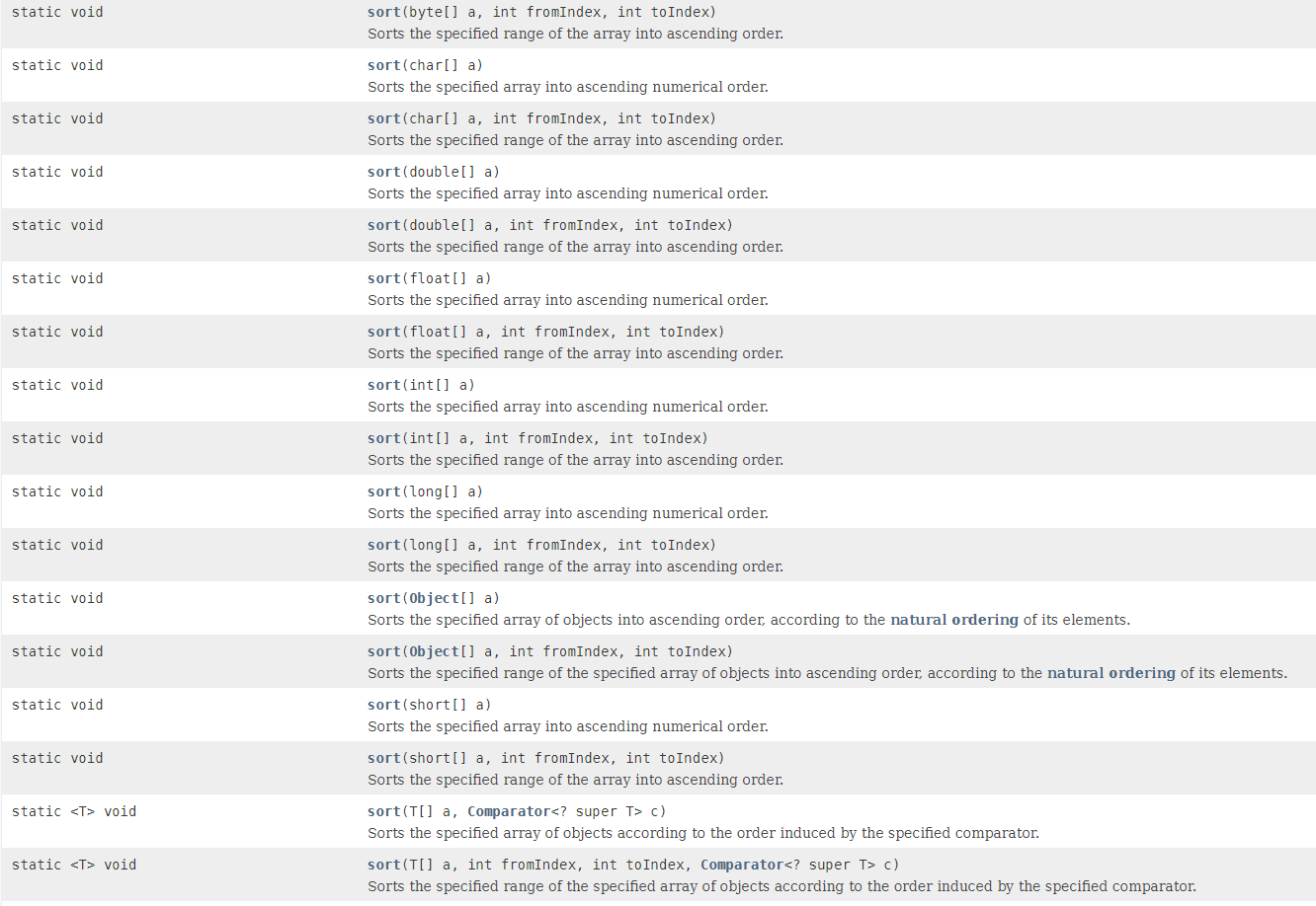 API문서를 살펴보면 여러 가지 타입에 따라 사용할 수 있도록 overloading 된 sort() 메서드를 볼 수 있습니다.