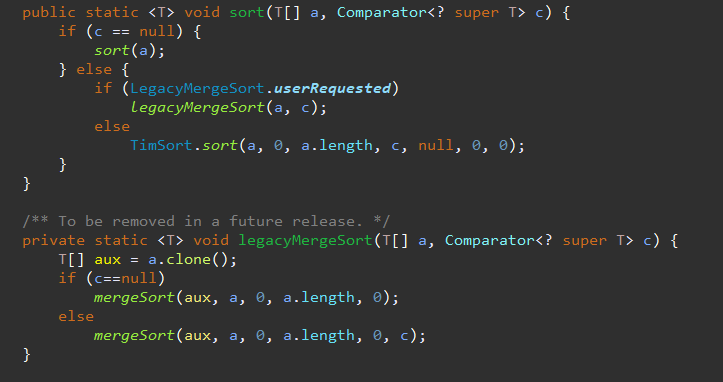 legacyMergeSort() 메서드는 추후 릴리즈 될 버전에서는 사라질 것이므로 실제로 내부 소스는 파라미터로 받은 Comparator가 null이면 sort()를 null이 아니면 TimSort.sort()를 실행합니다.