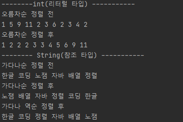 참조 타입은 30라인에 String배열을 생성해주고, 39라인에 Arrayss.sort() 메서드를 사용해서 정렬하였습니다.