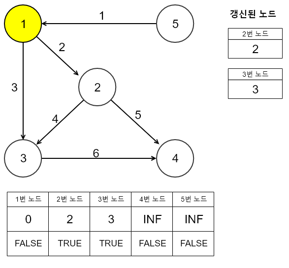 2번과 3번 노드는 그래프에서 보시는 것처럼 각 간선의 거리 값으로 최단거리 테이블을 갱신해주었습니다.