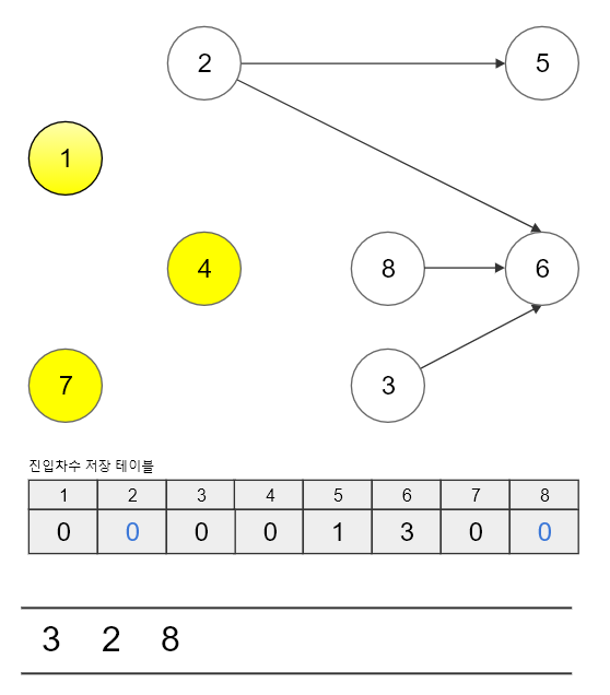 마지막으로 큐에서 6번 노드를 꺼내고 인접한 노드들을 찾아 진입 차수 테이블을 갱신시켜줍니다.